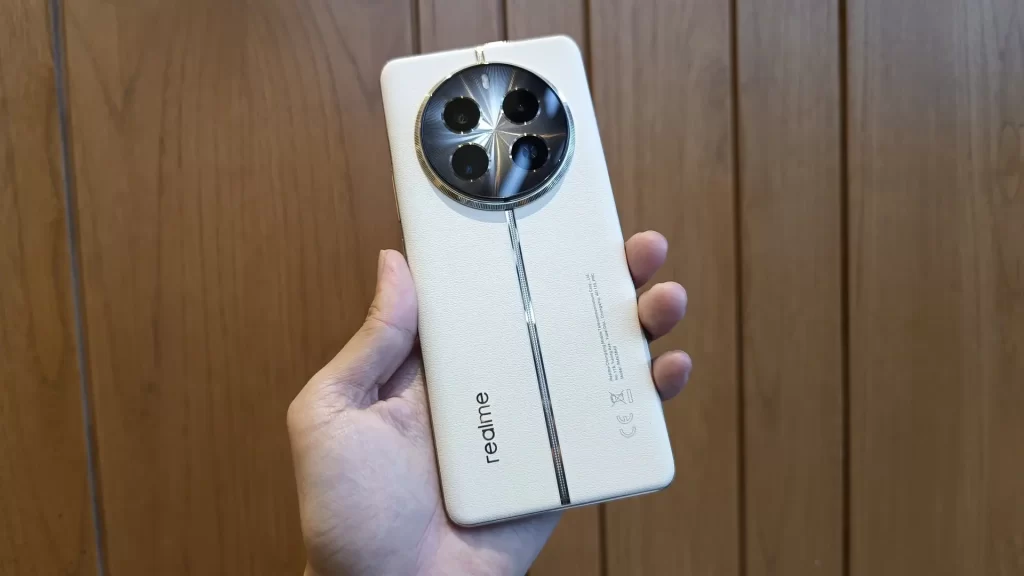 Di samping itu, desain panel belakangnya agak mirip dengan pendahulunya Realme 11 Pro Series, berbahan kulit dan memiliki aksen jahitan vertikal di bagian tengahnya. Namun, desain bump kamera kini tampil lebih mewah dengan ring berwarna emas mengitari bump kamera yang masih berbentuk bulat.